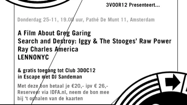 We hebben weer drie energieke muziekdocumentaires geselecteerd, waarin niet de minste muzikanten voorbij komen, en beginnen met een korte film over het leven van de Amerikaanse roots songwriter Greg Garing. Lezers van de 3VOOR12 nieuwsbrief krijgen evenals IDFA voordeelpas-houders weer fikse korting: zij betalen 20 euro (i.p.v. 26 euro).