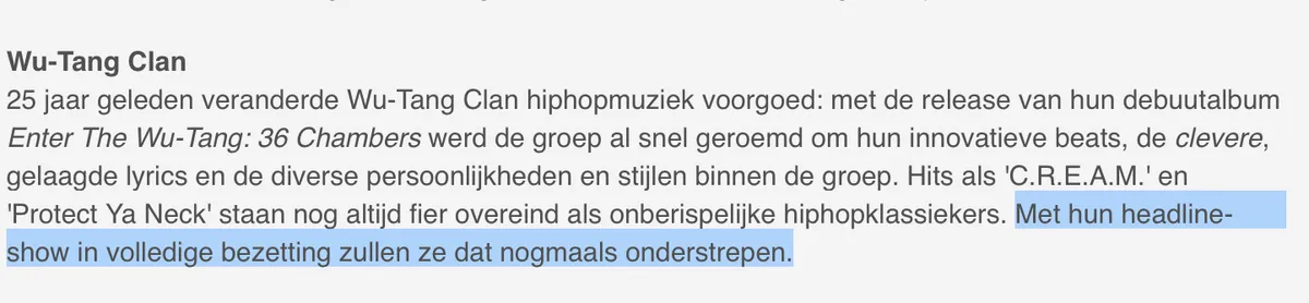 Van Kessel's slag om de arm is overigens in tegenspraak met het persbericht waarmee de show aangekondigd werd. Daar is wel degelijk sprake van een 'volledige bezetting'. Volgens Van Kessel is het bij dit soort shows niet gebruikelijk dat contractueel vastgelegd wordt wie er mee komt. ‘Wu Tang is een los-vast collectief van in totaal wel dertig ‘gerelateerde’ leden, waarbij de kern bestaat uit negen mensen. Wij mogen de naam Wu Tang Clan voeren, maar wie er precies komt weten wij ook niet precies. Je zou denken dat Method Man bij zo’n belangrijke tour wel meekomt, maar keiharde garanties geven ze daarvoor niet.’