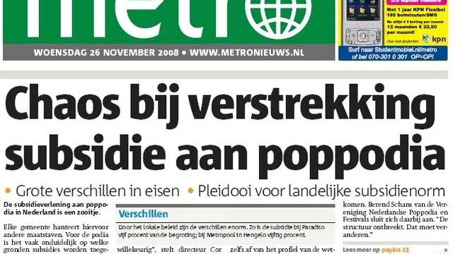Dagblad Metro onthult woensdag op de voorpagina een ‘chaos bij verstrekking subsidie aan poppodia’. Het artikel spreekt van ‘een zooitje bij de subsidieverlening’. De verslaggevers, twee stagiairs die samen het stuk schreven, verwijzen naar de grote verschillen in subsidiebedrag tussen zalen. Als voorbeeld wordt ondermeer het grote verschil in percentage subsidie op de gehele begroting tussen Paradiso (5%) en Metropool in Hengelo (50%) genoemd. Op de voorpagina pleiten de Nederlandse poppodia voor een landelijk subsidiesysteem. Maar dit is geheel niet terug te lezen in de tekst en geprinte uitspraken van zaaldirecteuren. Betrokkenen zijn boos over de inhoud en totstandkoming van het artikel. Ze stellen dat het alleen maar schade kan veroorzaken.
