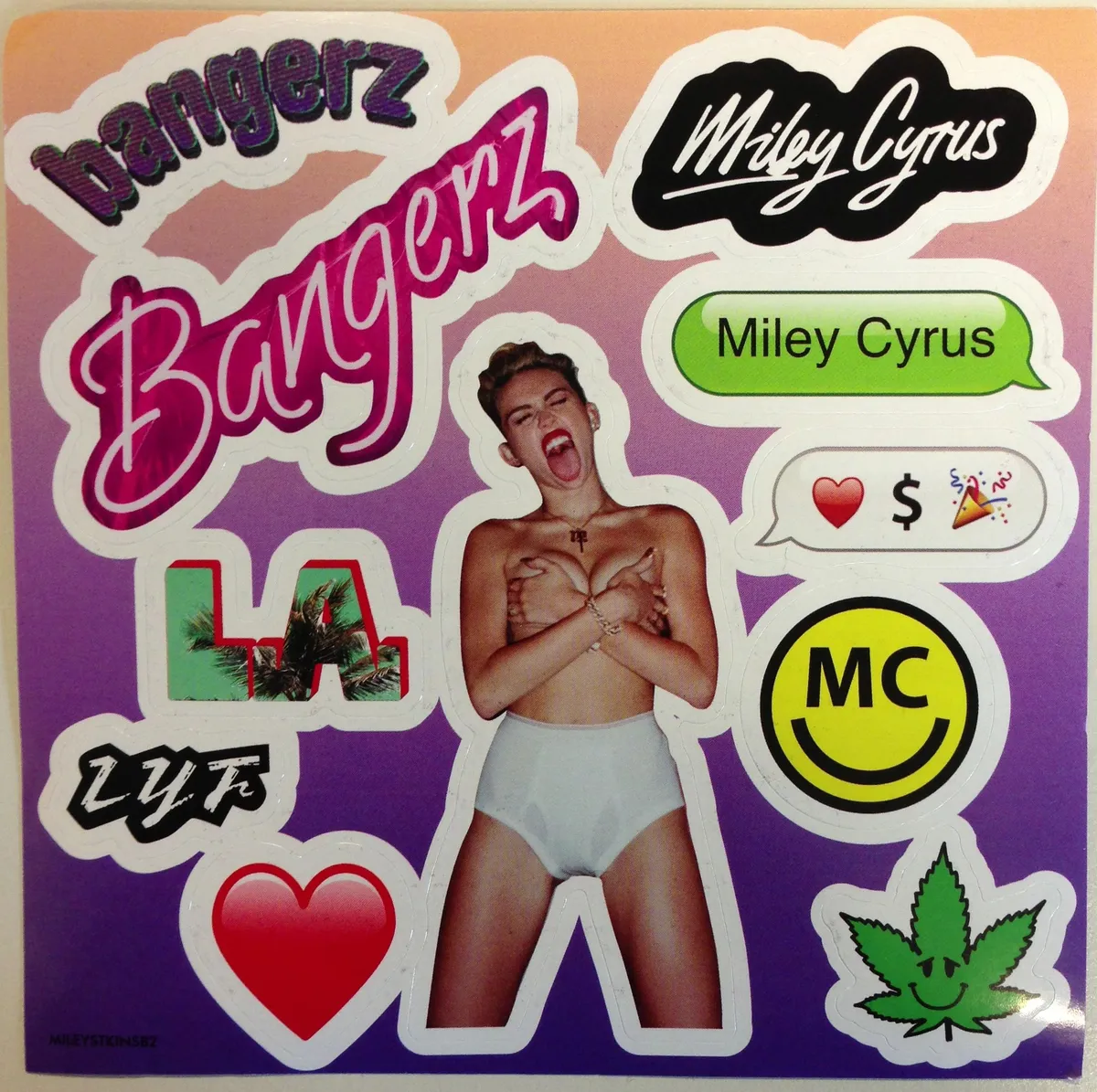 Er zitten stickertjes bij het nieuwe album van Miley Cyrus. Miley in haar onderbroek, haar handen voor haar borsten. Een wietblaadje. En drie emoticons: een hartje, een dollarteken en een feesthoedje. Love Money Party, ook de titel van een track op haar album. Miley Cyrus gaat lekker. Haar twerk-moves bij de MTV-awards maakten haar de meest besproken popster van het moment. Single Wrecking Ball - met al net zo geruchtmakende video - is haar grote internationale doorbraak. Miley Cyrus' coming of age-verhaal weerspiegelt de nachtmerrie voor iedere ouder in het internettijdperk. Feilloos op de grens van preutsheid en ordinaire geilheid die het web domineert.
