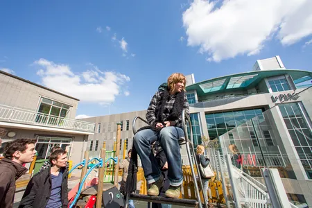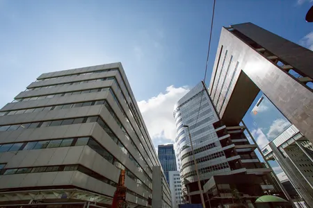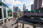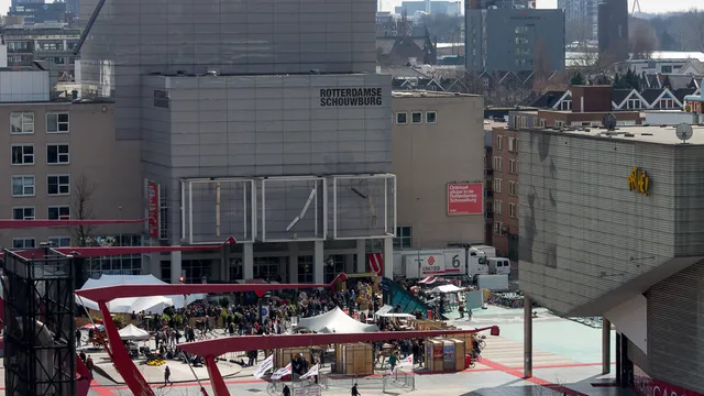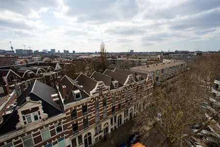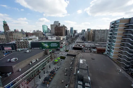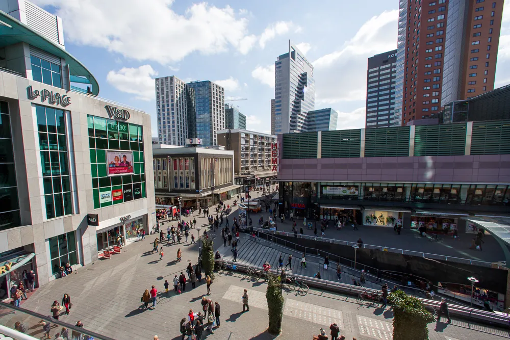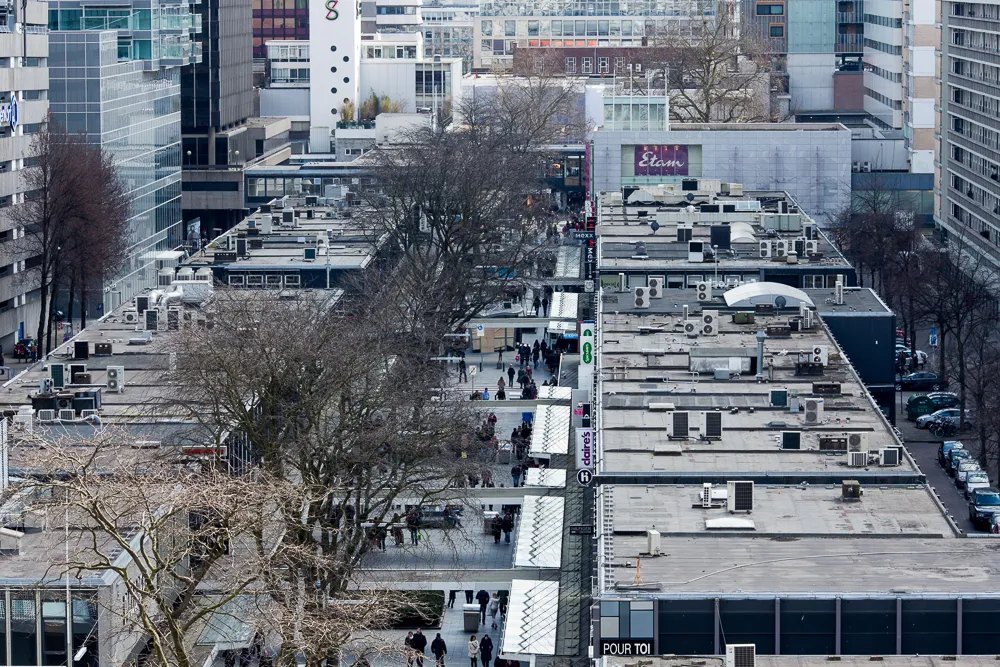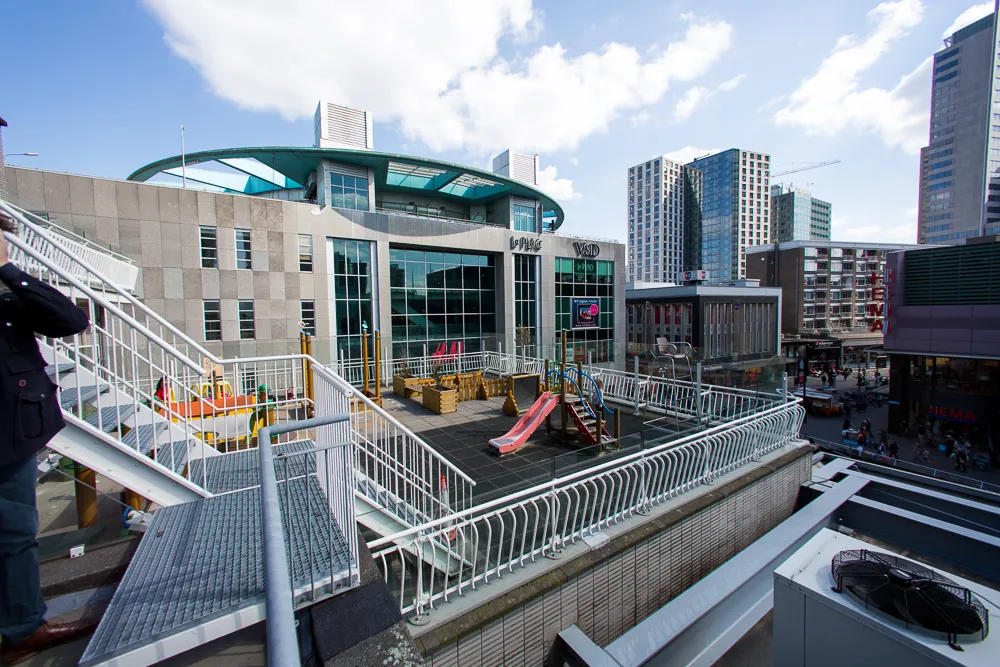 Het volgende dak is dat van één van de oude kantoorpanden op het Weena. Of eigenlijk achter het Weena, want er zijn in de loop der jaren modernere gebouwen voor gebouwd, waardoor het hele Weena is verkast. Het dak van dit pand is wat hoger en het uitzicht is dan ook een stuk weidser. Leuk is vooral hoe Plaza Mozaïque er hier vandaan uitziet. De sessies van 3voor12 zijn in volle gang en het is er goed druk. Ook de bedrijvigheid van de Lijnbaan wordt meegenomen in de tour. Wist u bijvoorbeeld dat de Lijnbaan de eerste autovrije winkelstraat ter wereld was en daarnaast een Rijksmonument is? Leerzaam, maar wederom zonder rijmvormen.