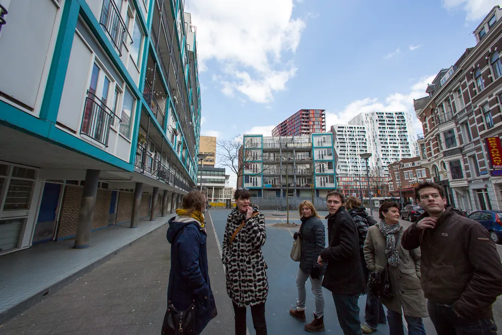 Vanuit een samenwerking tussen Motel Mozaïque, Rotterdam Archiguides, Architectuur Instituut Rotterdam (AIR) en het Architectuurfilmfestival Rotterdam (AFFR) is dit jaar een bijzondere excursie in het leven geroepen: De Dakenroute. De spannende omschrijving in het programmaboekje, “Poems from a rooftop”, belooft veel goeds. Vanaf Plaza Mozaïque begint de voettocht met gids richting de Meent, om rechtsaf te slaan op Rodezand.
