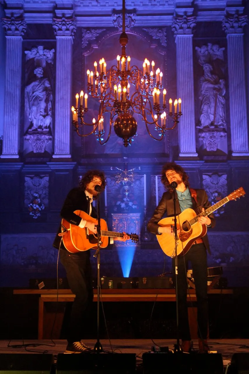 Het is wellicht een open deur bij een eeneiige tweeling, maar Sander en Arnout Brinks voelen en vullen elkaar vocaal en instrumentaal perfect aan. Arnout neemt iets vaker de leadpartijen en heeft nog een mondharmonica achter de hand. Wat wringt is de klankkleur van beide broers. Klinken ze in het lage nog als Paul Simon, in de hoge stukken is het wat pieperig, als een dubbele lachgas-dosis. Daar moet je tegen kunnen, net als de droge humor die eerst vermakelijk is, maar net wat te ver doorgevoerd wordt. Niettemin een goede vondst om de kerkgangers te laten zingen voor de jarige in het publiek. Het duo speelt redelijk wat nummers van de nieuwe plaat Seek & Sigh, die 12 april bij Excelsior verschijnt en waarmee de teller op vijf albums komt. Met zoveel songs op het repertoire zouden ze wel een iets minder eenvormiger set kunnen smeden, zoals het ook geen kwaad zou kunnen om enkele nummers live in een minder braaf jasje te gieten. (Ingmar Griffioen)