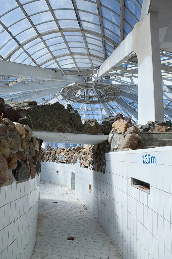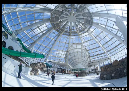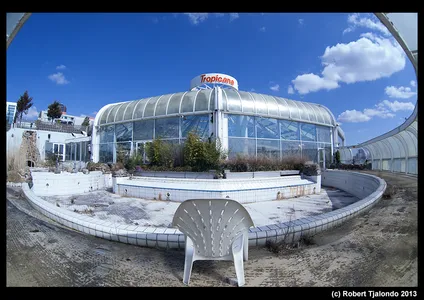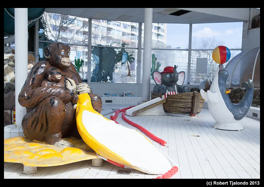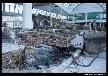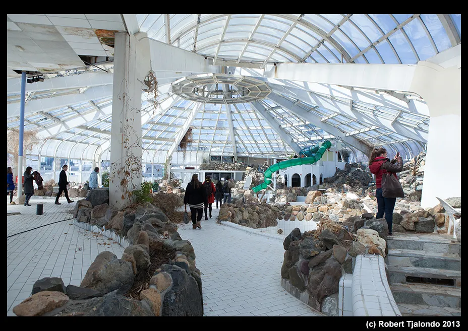 Dat dit oord, ooit van Center Parcs en gebouwd in 1988, al 3 jaar dicht is, is duidelijk te zien. Het zwembad is leeg, de planten zijn dood, een en ander is vernield en een achtergelaten zwembal herinnert nog aan die goede oude tijd.