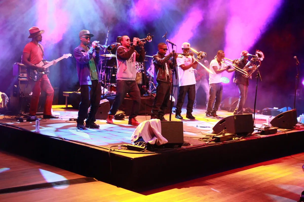 De straat is van oudsher hun terrein, maar inmiddels zijn ze gepromoveerd tot schouwburgschouwspel. Verbazingwekkend wat een verschil dat maakt. Ineens telt niet alleen de pure energie, maar ga je beter naar composities luisteren (een beetje plat) en je storen aan de raps (heel plat). In het geluid vinden we sporen van hiphop, jazz en calypso. Dat klinkt divers, maar er zit een stuk minder vernuft en subtiliteit in het geluid dan je zou hopen. Qua performance blijft het ook allemaal zo braafjes. Het grootste deel van de set staan de zes blazers netjes op een rij, en een paar entertaining trucs hadden helemaal geen kwaad gekund. Hop, daar gaat een shirt uit, dat dan weer wel. En twee, drie, en vier. Voor enige opwinding zorgt dat wel, maar de beloofde hypnose blijft uit. (Atze de Vrieze)