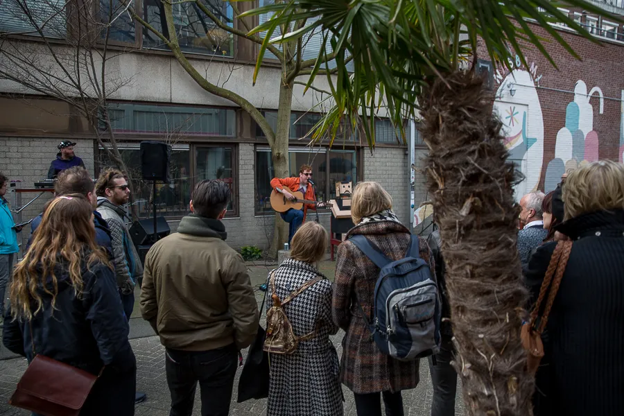 Van het Plaza Mozaïque op het Schouwburgplein via de Karel Doormanstraat en de Witte De With naar de kunstzinnige Hoornbrekersstraat. Dat is de route die we vrijdagmiddag volgen. Laatstgenoemde staat volop in het teken van kunst, met talloze ateliers, muurschilderingen en ontwerpbureaus. We stuiten zowaar op een heuse straatdichter in de gedaante van Jordy Dijkshoorn (De Likt). Zijn voorgedragen gedichten, op gitaar begeleid door Jan W. Minnaard (voorheen Wolf In Loveland), maken het tot een humoristische editie met daarin een overduidelijke voorliefde voor het “Manhattan aan de Maas”. Rotterdam dit, Rotterdam dat. Tsja, dat Dijkshoorn hier vandaan komt, moge duidelijk zijn.