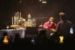 ‘Nee, dit is het ook niet!’ De tafel is gedekt voor Mula B, de kaarsjes branden, hij heeft een scharlaken rood overhemd aan (net Tony Montana) en naast hem zit zijn muzikale sparringpartner en eenmansband Rangel Silaev op zijn akoestische gitaar te pingelen. In dit akoestische blokje proberen ze nog wat extra drama te persen uit liedjes als ‘Moes Montana’ en ‘Faktap Broeder’ (mooie vondst om dat zonder de beat van IliassOpDeBeat en Trobi te spelen). AFAS Live zingt uit volle borst mee, maar het klinkt voor Mula B nog niet helemaal lekker. Als hij vervolgens het Plathaagse 'Jè Bent Ut Voâh Mèn’ inzet, schuift de flamencoband De Règâhs aan. ‘Jij bent het voor mij, want je danst zo mooi flaminGO!’, klinkt het met harde Haagse G. Kijk, dit is wat-ie wilde horen. ‘Alsof we het zo hebben bedacht’, grinnikt Mulamoes. Ook zijn eigen ‘Bandolero’ krijgt vervolgens die flamenco-treatment.