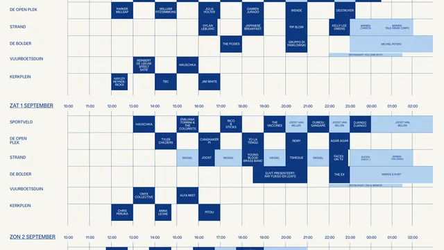 Ook is er een rits dj's toegevoegd aan het programma: St. Paul, Joost van Bellen, Michiel Peeters, Sassy J, Volcano Boys, Pieter Jansen & Bob Verhoeven, Tala Drum Corps en Johan Gijsen & Kurt Overbergh. Ook cool: de Vuurboetsduin is terug, en Into The Great Wide Open heeft meteen een eerste versie van het blokkenschema online gezet.