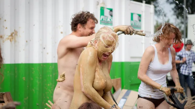 Toen de stilte van de T'ai chi in de Lima-tent net verstorven was stak een man met modderhanden zijn hoofd boven het hek. Hij kondigde roepend als een marktkramer 'Naakt kleiwerpen' aan. Ongekleed hompen klei slingeren naar een sculptuur en naar elkaar. Een klein groepje onverschrokken festivalgangers gaf zich, buiten het zicht van het publieksterrein, maar open en bloot voor alles erachter, eraan over. Een verslaggever en een fotograaf van het VPRO-jongerenmerk Dorst mochten meesmijten en het vastleggen, mits naakt. De klei was al snel een tweede huid.