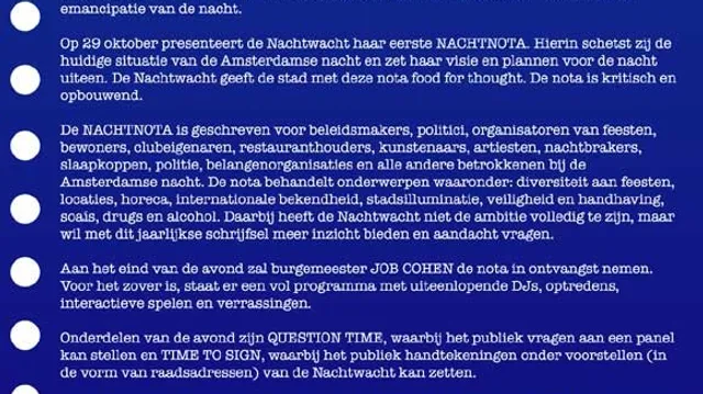 Woensdagnacht presenteert een achtkoppig gezelschap de eerste Nachtnota aan de burgemeester van Amsterdam. "Alles ligt op zijn reet, de stad moet bruisender worden."