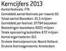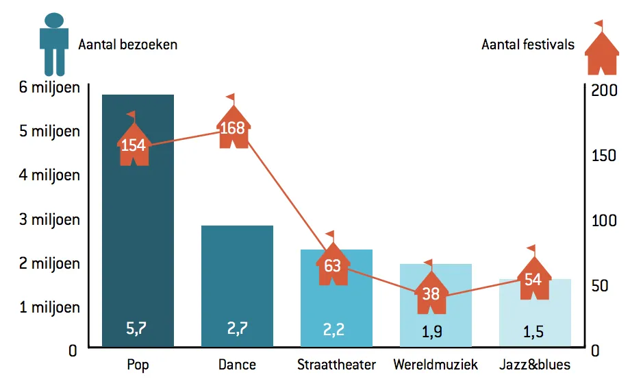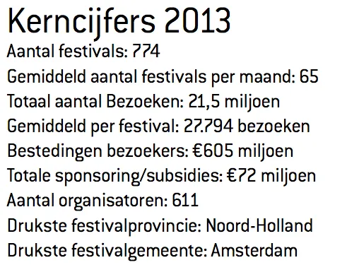 Na een klein dipje in 2012 is de Nederlandse markt voor kunst- en cultuurevenementen het afgelopen jaar weer gestegen. Dat meldt de Vereniging Voor Evenementenmakers (VVEM) op basis van eigen onderzoek. De 774 festivals (alleen festivals groter dan 3000 bezoekers tellen mee) trekken in totaal 21,5 miljoen bezoeken (een weekendbezoek aan Lowlands geldt als drie bezoeken). Dance-festivals groeien het hardst: in 2013 waren er maar liefst 29% meer dan het jaar ervoor.