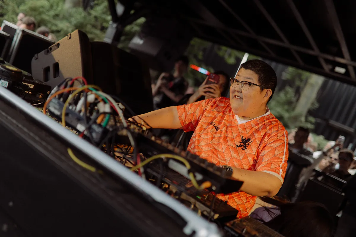 Vooral bij de Area.14 was dat een goede investering, waardoor de kleine stage als een soort Boiler Room bos-editie aanvoelt. Perfect om je filmpjes voor op de ‘gram te maken, en zo is er ook geprogrammeerd: zaterdag ligt hier vooral de focus op interessante, clubby techno-benaderingen met sets van bijvoorbeeld Mac Declos b2b Akua en de dromerige dansvloer-diaspora van Ineffekt en Moody Mehran. Zondag is het een echte ‘TikTok-stage’ waar de meest virale dj’s draaien. Dat pakt helaas niet altijd even goed uit. Neem bijvoorbeeld cultfenomeen Atsuo the Pineapple Donkey, een gast uit Japan die ook niet precies begrijpt wat hem is overkomen. Het ene moment maakt-ie simpele techno-jams vanuit zijn klushok, om het hostel dat-ie runt te promoten. Het volgende gaat-ie viraal, vliegt hij de wereld over om op festivals te spelen, en is hij de meest getipte act op TikTok. Tussen tracks door (van een soort cover van nineties techno-classic ‘Camargue’ naar kneiterharde acid) laat-ie het helemaal stilvallen, en zijn switches qua volume en bpm zijn nogal abrupt.