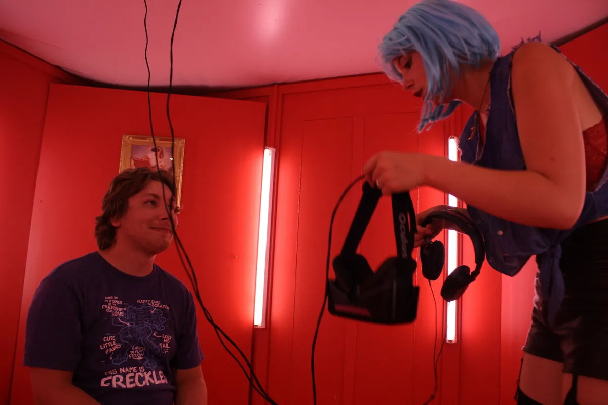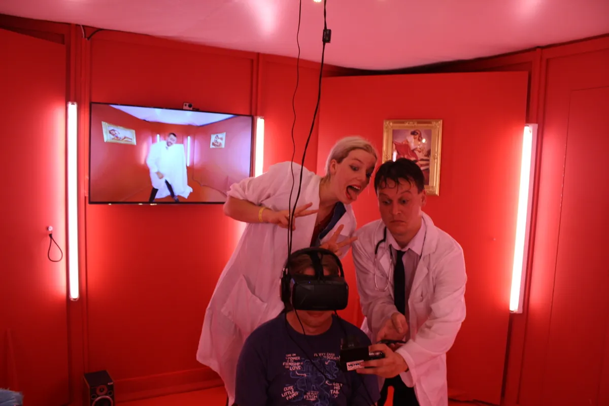 De zon staat pal boven de peepshow en wie interesse heeft, moet nog even geduld hebben: een jongen gekleed in labjas laat weten dat de show een individuele ervaring is die bij elkaar vijf minuten duurt. Om het zo hygiënisch mogelijk te laten lopen, krijgen bezoekers blauwe hoesjes om de schoenen, het moet natuurlijk wel classy zijn.