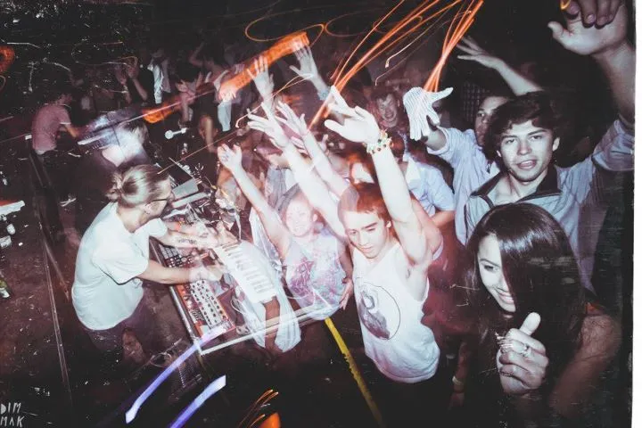 In LA spelen we in de club van Steve Aoki. Elke dinsdag zijn daar de Dim Mak Tuesdays, waar we de eer hebben om te mogen spelen. Hele coole vibe daar. Het podium is te klein en daarom zetten we onze visuele installatie op het podium, en onze instrumenten ervoor. Daardoor (en omdat de club uitverkocht is) staan we midden in het publiek. En dat publiek gaat los! Levert mooie plaatjes op, kijk maar. De trendy gay meneer van 72 is er ook. Ook hij gaat uit z'n dak en is eigenlijk de echte ster van de avond. De volgende ochtend gaan we nog even langs bij het Dim Mak hoofdkantoor.
