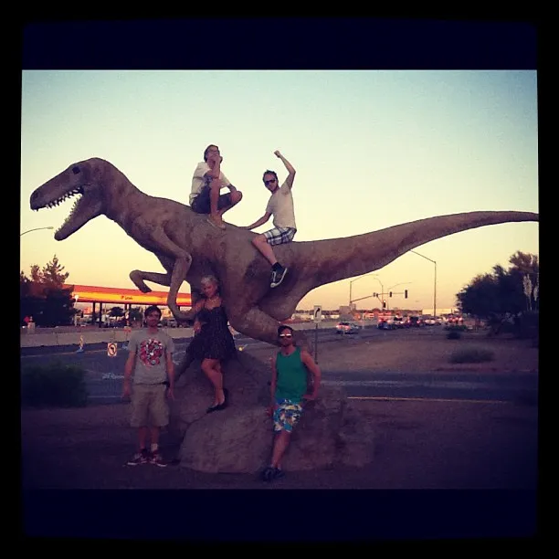 Op dat moment weet ik niet meer precies of ik zo zweette van de temperatuur of van de gedachte om met een Jerrycan lopend het dichtstbijzijnde tankstation te gaan zoeken. Want als je moet gaan lopen onder dat heerlijke zomerzonnetje en een temperatuur van 48 graden hou je het waarschijnlijk nog geen kilometer vol. Wel heel boeiend trouwens, de woestijn hier. Hoe westelijker je vanuit Texas rijdt, hoe heter en droger het wordt. Hier en daar staat een dinosaurus, die overleven die hitte daar op een of andere manier, ze zijn ook heel vriendelijk, ze hebben trappetjes aan hun lichaam hangen waarmee je op hun rug kan klimmen. En ze hebben lichtjes in hun mond, zodat de mensen 's avonds beter kunnen zien waar ze hun SUV kunnen parkeren.