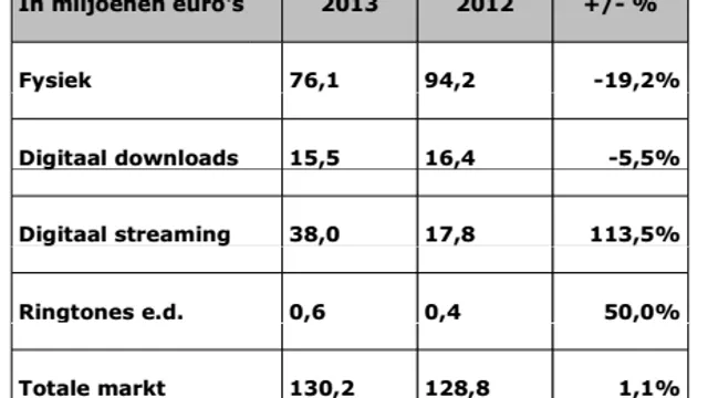 Sinds Spotify in 2010 voet op Nederlandse bodem zette, zit streaming duidelijk in de lift, zodanig dat dit jaar voor het eerst het verlies aan fysieke verkopen gecompenseerd wordt. Daarbij moet opgemerkt worden dat de NVPI per dit jaar anders is gaan meten. Niet langer worden de consumentenbestedingen gemeten, maar de omzet van de aangeslotenen, oftewel de labels. Wie de jaarcijfers van vorig jaar naast die van dit jaar legt, ziet dan ook een opvallend verschil: onderzoeksbureau GFK rapporteerde in 2012 een stijging van 236% op het gebied van streaming, tot 29,6 miljoen euro. In de cijfers van dit jaar noteert NVPI bij 2012 17,8 miljoen.