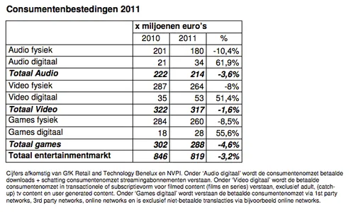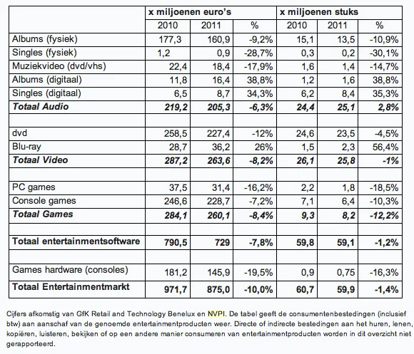 De Nederlandse platenzaken moesten dit jaar opnieuw een flinke daling in de verkoop van cd's constateren, zo blijkt uit de jaarcijfers van branchevereniging NVPI. In 2011 gingen 13,5 miljoen fysieke albums over de toonbank, 10,9% minder dan in 2010. Downloads werden wel veel meer verkocht, maar het eindsaldo in omzet is negatief: de totale muziekomzet bedroeg 205,3 miljoen euro, 6,3% minder dan in 2010.