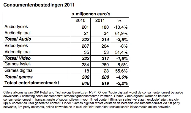 Dat wil zeggen: van de totale door NVPI in kaart gebrachte omzet. Daaronder vallen cd-verkopen in retail en bekende webshops (ook vanuit het buitenland) en downloads bij onder meer iTunes. Andere vlakken zijn nog tamelijk blinde vlekken. De omzet uit streamingdiensten als YouTube en Spotify is op dit moment niet helder. Dat maakt deze jaarcijfers beperkt, zeker nu dergelijke diensten een steeds groter deel van het totaal lijken uit te maken. Spotify sloot dit jaar verbonden met Facebook en KPN, wat goed was voor de bekendheid van de dienst. Verder lanceerden in ons land afgelopen jaar streamingdiensten Deezer en Rara. Een deel van de omzet van dergelijke diensten gaat rechtstreeks naar platenmaatschappijen, een deel loopt via licentiedeals met Buma/Stemra.