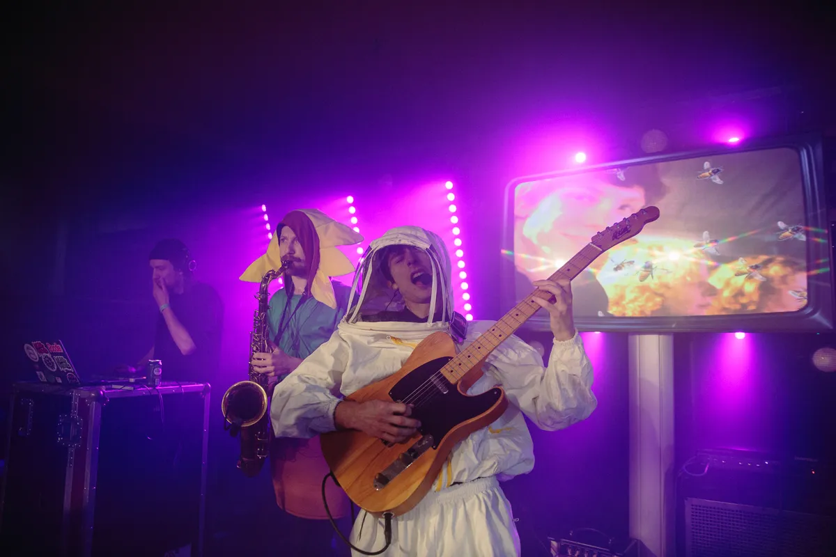 Wie langs de ballonnenkunst van TIMNOTSIMON en schommels door de fabriek wandelt (terwijl de lentezon inmiddels door de ramen tuurt!) en probeert om grote lijnen te ontwaren in het programma, zal concluderen dat absurdisme hoogtij viert in Nederlandse muziek anno 2023. De meest ontregelende show, dat is die van Bumble B. Boy. Buiten gaat de rij nog een metertje of tien verder, want iedereen lijkt te willen weten wat de hype is rond de zogenaamde kinderentertainer, die ook al geboekt is voor Best Kept Secret. Want eh, wat is dit nou eigenlijk? Een gast in een imkerpak die niet tegen het publiek durft te praten omdat hij anders gaat kokhalzen, een band gekleed in bloemetjespakken en een mega-irritante cameraman die beelden maakt voor op het scherm maar daarmee iedereen laat struikelen over zijn kabels. Op z’n zachtst gezegd een wonderlijke vertoning, maar de honing smaakt evengoed naar meer. Het werkt eigenlijk supergoed, die dansbare artpunk van Bumble B. Boy, een soort kruising tussen Talking Heads en Thee Oh Sees. Heb je ooit iemand in een imkerpak zo agressief een liedje horen zingen over het plezier dat-ie heeft in het buitenzetten van het vuilnis? Nou, dat dus.