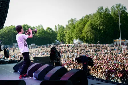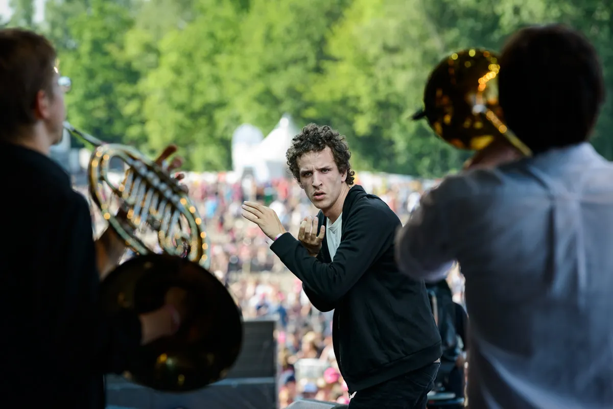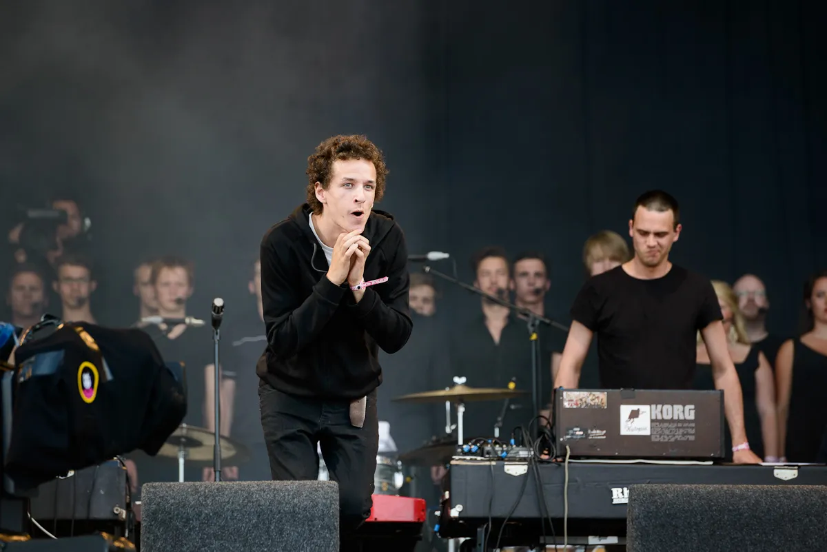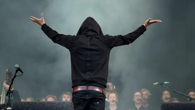 Dat kleine mannetje met de hand op zijn rug. Colin Benders, Kyteman. Drie jaar geleden was de Converse tent te klein voor zijn Hiphop Orkest. Nu staat hij op het grote podium met The Kyteman Orchestra, 53 man sterk. De set opent met 'Preaching To The Choir', een klassiek werk van Carmina Burana-achtige statuur. Grootser dan Muse en Rammstein bij elkaar. Geen zwart gat zou het zonder flink slikken kunnen opslokken. Kyteman staat hier zeker niet voor eigen parochie te preken.