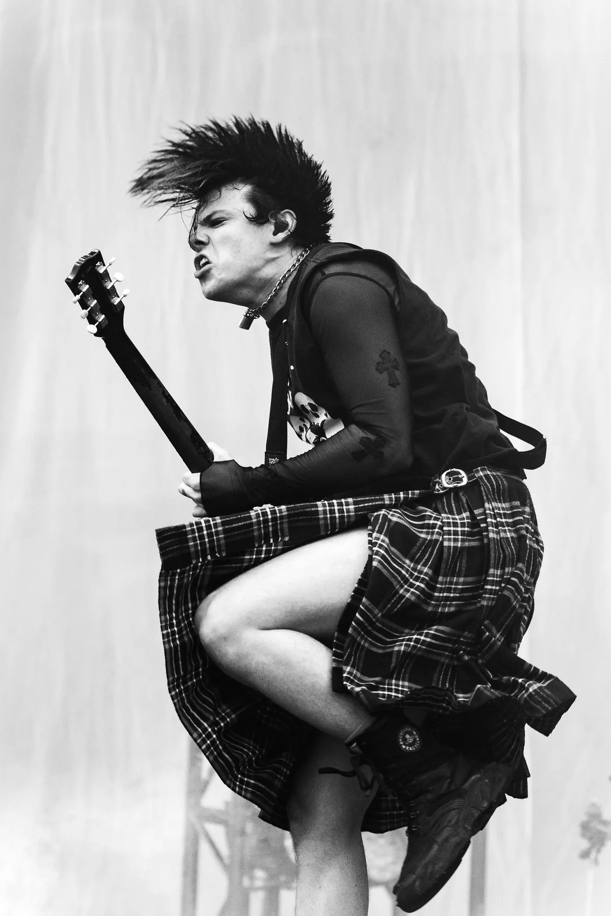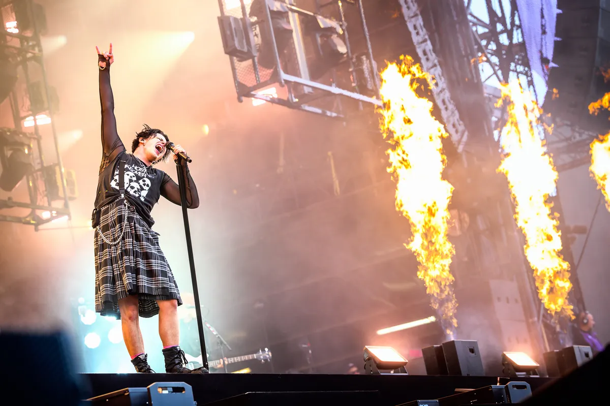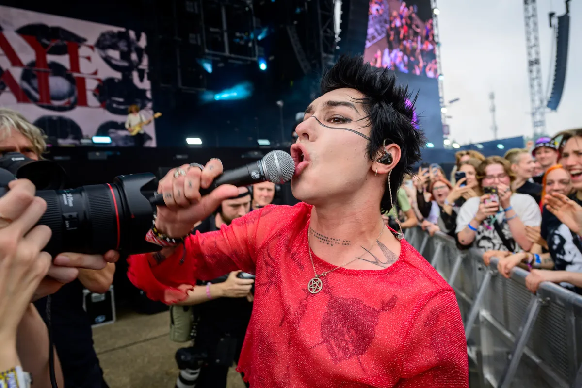 Flats, daar gaat-ie, plat op zijn reet, kilt in de lucht. Dat krijg je ervan: rennen op een nat podium. Maar Yungblud is niet van plan te leren of hij geeft geen fuck om een paar blauwe plekken. Gezien zijn imago waarschijnlijk het laatste. We zijn tien seconden verder en flats, daar gaat-ie weer onderuit. Gelukkig kan-ie er zelf om lachen.