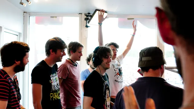 Met een zucht gaat zanger Niek Nellen van Afterpartees erbij zitten. 'Het valt me nu pas op, hoe moe ik eigenlijk ben.' Niet gek, want 'hectisch' is een understatement voor wat de band vandaag heeft meegemaakt: drie uur in de file omdat: 'wij zo stom waren om de borden te volgen', een optreden in de nieuwe Stage 4 met een afscheid van drummer Teun, in de 3FM-studio om mee te delen dat het contract wordt getekend, optreden in de container, interviews, interviews... "Het mooiste is nog wel dat mensen uit Landgraaf buiten in hun tuin gaan zitten om files te bekijken," zegt Nellen, terwijl bassist Sjors Driessen en gitarist Jesse van den Munckhof aanschuiven.