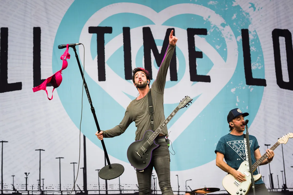 'Wat zien jullie er top uit in jullie regenponcho’s, het is net alsof ik naar een regenboog sta te kijken! Hoe is het met jullie daarachter op de tribune? Wat hebben jullie gedaan dat jullie daar moeten zitten? Is dat misschien de naughty chair? Maar hey, fuck de regen! Trek je er niks van aan. We weten best dat jullie hier zijn gekomen om nat te worden!' Welkom bij de heetste act onder de vrouwelijke Pinkpop bezoekers van onder de 25 jaar: All Time Low.