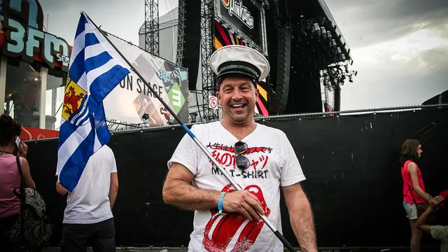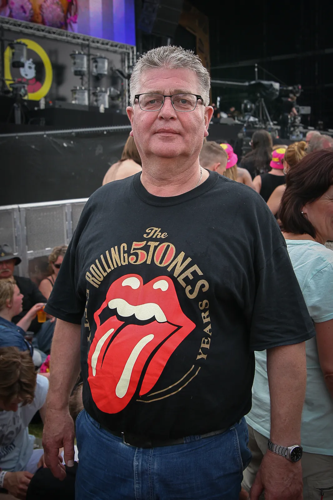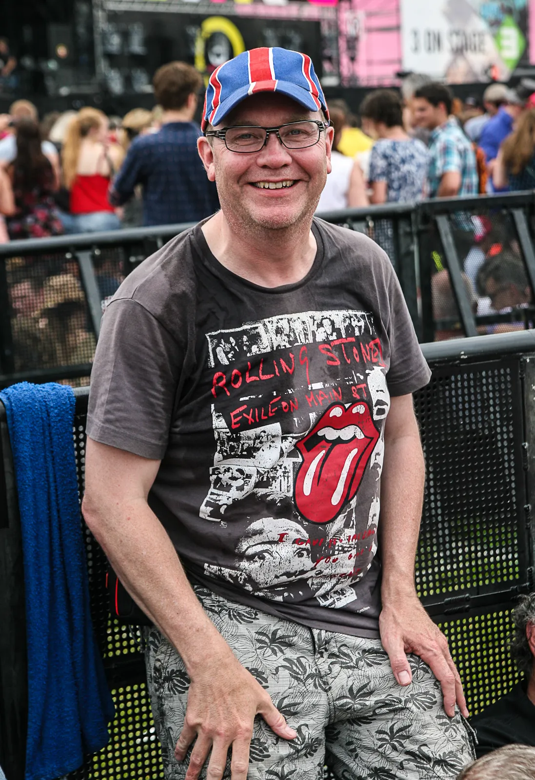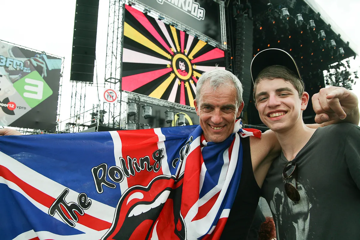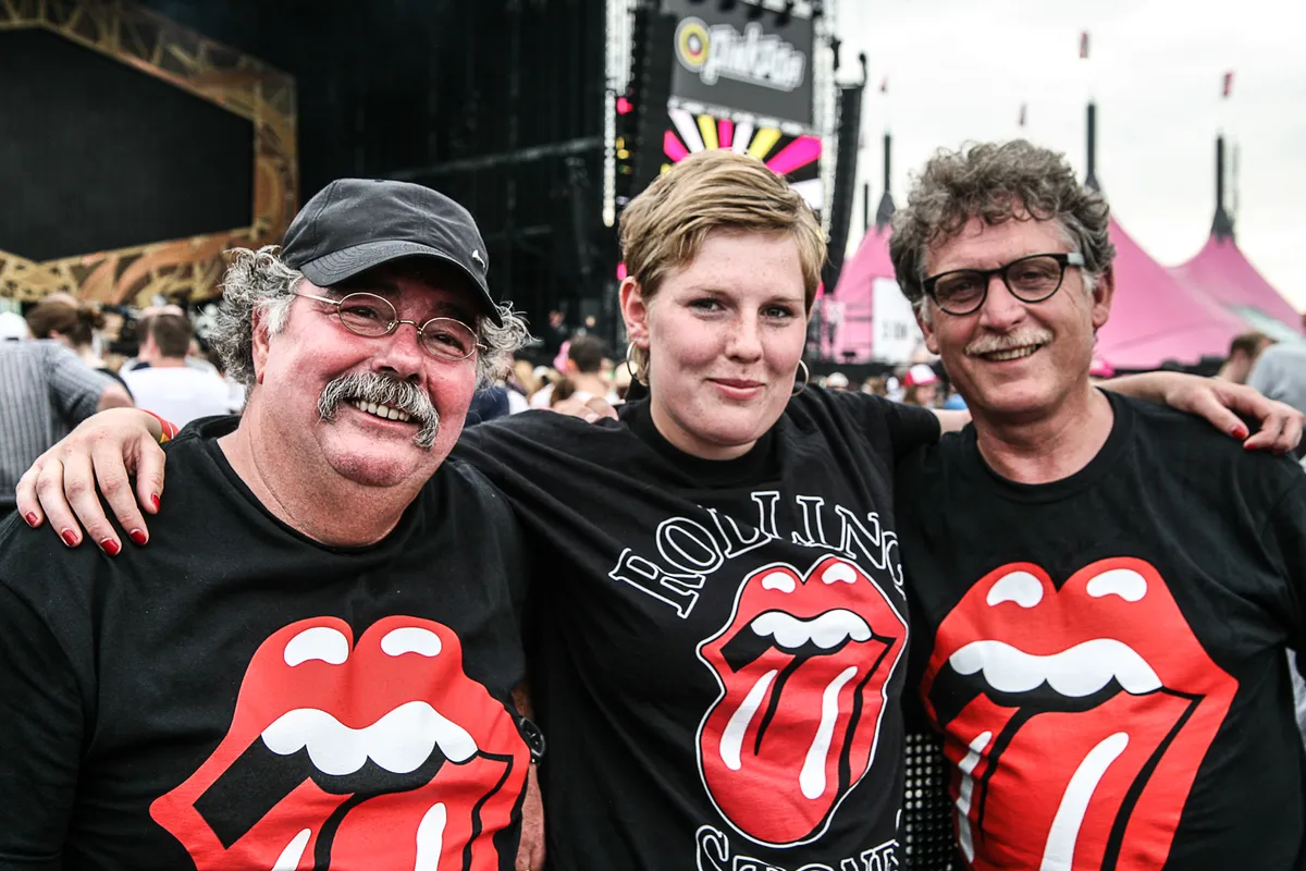 Het voorvak staat vol met duizenden fans. Velen van hen staan al vanaf vroeg aan de hekken geketend en verlaten hun plekje niet eens voor een beker bier. Alles om de perfecte plek te behouden. We spotten Marcel, die met een Stones-vlag om zich heen de mensen passeert. Marcel uit Pannerden heeft zijn twee zoons van 13 en 15 meegenomen. Wat is er mooier dan je Stones-ervaring te delen met je kinderen? Zoon Wes (15) is opgegroeid met de muziek van de band. "Dat kan ook niet anders, want m'n vader luistert nergens anders naar." Marcel heeft de band inmiddels een stuk of zes keer live gezien, waarvan de eerste keer in 1982 in de Rotterdamse Kuip. "Dat was toch wel het gaafste optreden. We stonden in het voorste vak, een halve meter van het podium af. Er waren ook nog drie Hell's Angels die ruimte maakten, dat ging gelukkig allemaal goed." Ook staan de concerten in de Amsterdam Arena en het Nijmeegse Goffertpark op het lijstje. Gelukkig is een ticket voor Pinkpop ook gelukt. "Om half negen 's ochtends hebben we drie laptops aangezet en godzijdank kwamen we snel door het online kaartensysteem heen."