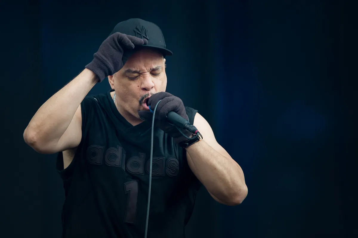 En wie staat daar vooraan in het eerste vak? Een tenger, veertienjarig meisje met een wit hoedje en zo'n jaren negentig-choker. Ice-T pikt haar er halverwege de show feilloos uit. 'Je bent de jongste hier, denk ik! Je had ook bij een Justin Bieber-show kunnen staan. Maar je staat hier, en daarom heb je nu een nieuwe oom. Ice-T. En als er óóit een jongen of een meisje met je fuckt, weet je wat je dan zegt? "Talk shit, get shot!"' Da's gelijk de titel van het beste nummer van de set, met een refrein dat je uit volle borst mee kunt zingen en een lompe gitaarriff die van Rage Against The Machine had kunnen zijn. 'Don't test me, I'm a psycho with a rifle.'