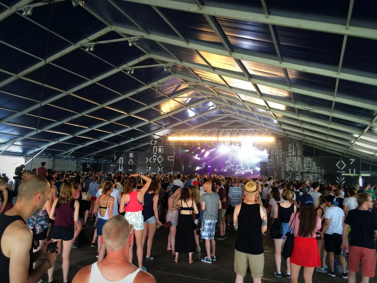 Lekker is dat 's avonds het weerbeeld verandert. Het begint te waaien op het Westergasterrein, en de frisse wind is meer dan welkom. Het wordt koeler buiten, al plakt iedereen natuurlijk al lang door het warme weer van vanmiddag of de liters bier die soms door de lucht vliegen. Wij zijn benieuwd naar Evian Christ, die rond de klok van tienen begint voor een nagenoeg lege Gashouder, iets dat we niet hadden verwacht. De Brit draagt een zwart shirt van de Italiaanse voetbalclub Juventus, en laat het weinige aanwezige publiek wel direct ontploffen. Dat doet hij met kerkelijke gospel, bass, dubstep en grime. Voor we het goed en wel doorhebben, vliegen er al bommen door de Gashouder. De rare geluiden van Evian Christ gaan af en toe door merg en been heen en regelmatig vliegt de Engelsman zonder veiligheidsgordels om alle kanten op. Hij gaat van hot naar her, versnelt, vertraagt, en versnelt weer. Dat Kanye West een groot fan van hem is, begrijpen wij maar al te goed. Het wordt tijdens zijn set ook wel iets drukker in de Gashouder, maar zo populair als een Kaytranada of een Flume, is Evian Christ bij lange na niet. Wie blijft staan, wordt overdonderd, dat staat vast. De visuals, die bewegen op de maat van de beat, zijn schitterend. Dat het niet zo druk is, zegt maar weinig over hoe goed of slecht het is, want goed is het. Het moge duidelijk zijn dat deze talentvolle jongen een grote toekomst voor zich heeft.