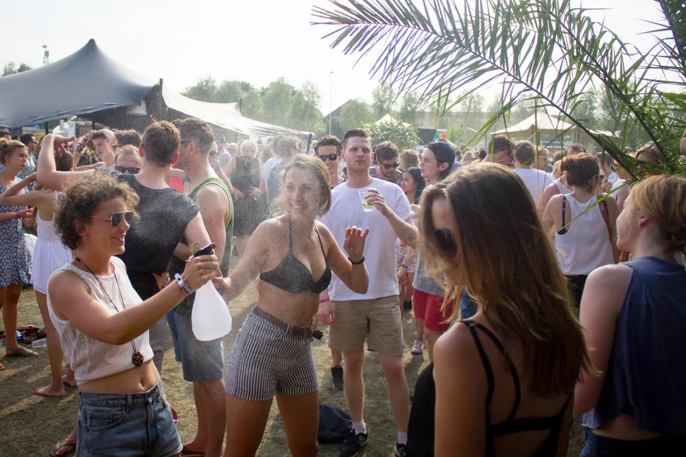 De warmste dag van het jaar, zo wordt gezegd, en eigenlijk is dat wel gezellig op het Amsterdamse Westergasterrein, tijdens de tweede dag van PITCH 2015: elke zoveel stappen besprenkelt een vreugdevolle hipster je amicaal met een plantenspuit, meisjes in bikini’s houden de waterpistooltjes in de lucht en met op zijn tijd een raketje in de hand gaat iedereen hartstikke lekker. Verkoeling te over, dus, en met een biertje en pilletje minder en flesje water meer zijn er eigenlijk geen nare taferelen te vinden op het festivalterrein.