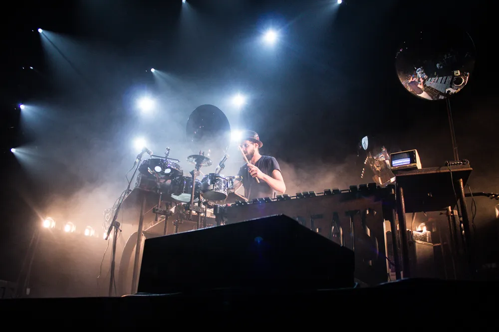 Beter tot zijn recht komt Binkbeats, het alias van de Utrechtse percussionist Frank Wienk. Een bekend gezicht dat in een ver verleden nog drumde bij Eefje de Visser, de grote trom en kleine priegelinstrumentjes beroert bij Kyteman, en nu alweer een tijdje opzien baart met video’s waarin hij live met een gigantisch instrumentarium de moeilijkere danceparels covert van o.a. Aphex Twin, Flying Lotus en Atoms for Peace. In de Gashouder vertolkt hij ook Default van laatstgenoemde, maar vooral eigen werk. En wat is Wienk inmiddels gegroeid sinds zijn podiumdebuut op Le Guess Who? vorig jaar. Er zijn geen ellenlange stiltes meer tussen nummers, waar hij elk kabeltje moet omprikken, de bassen zijn bijzonder diep en ook visueel ziet het er alleen maar indrukwekkender uit met een drietal grote spiegels. Zo kun je meekijken wat Wienk nou precies uitspookt achter zijn gigantische berg aan instrumenten en hoe hij die beats live in elkaar knutselt. Zang is nog altijd niet zijn sterkste kant en de Gashouder loopt niet helemaal vol - wellicht omdat de set wat weinig dansbaar is - maar de climaxen kunnen op luid gejuich rekenen.