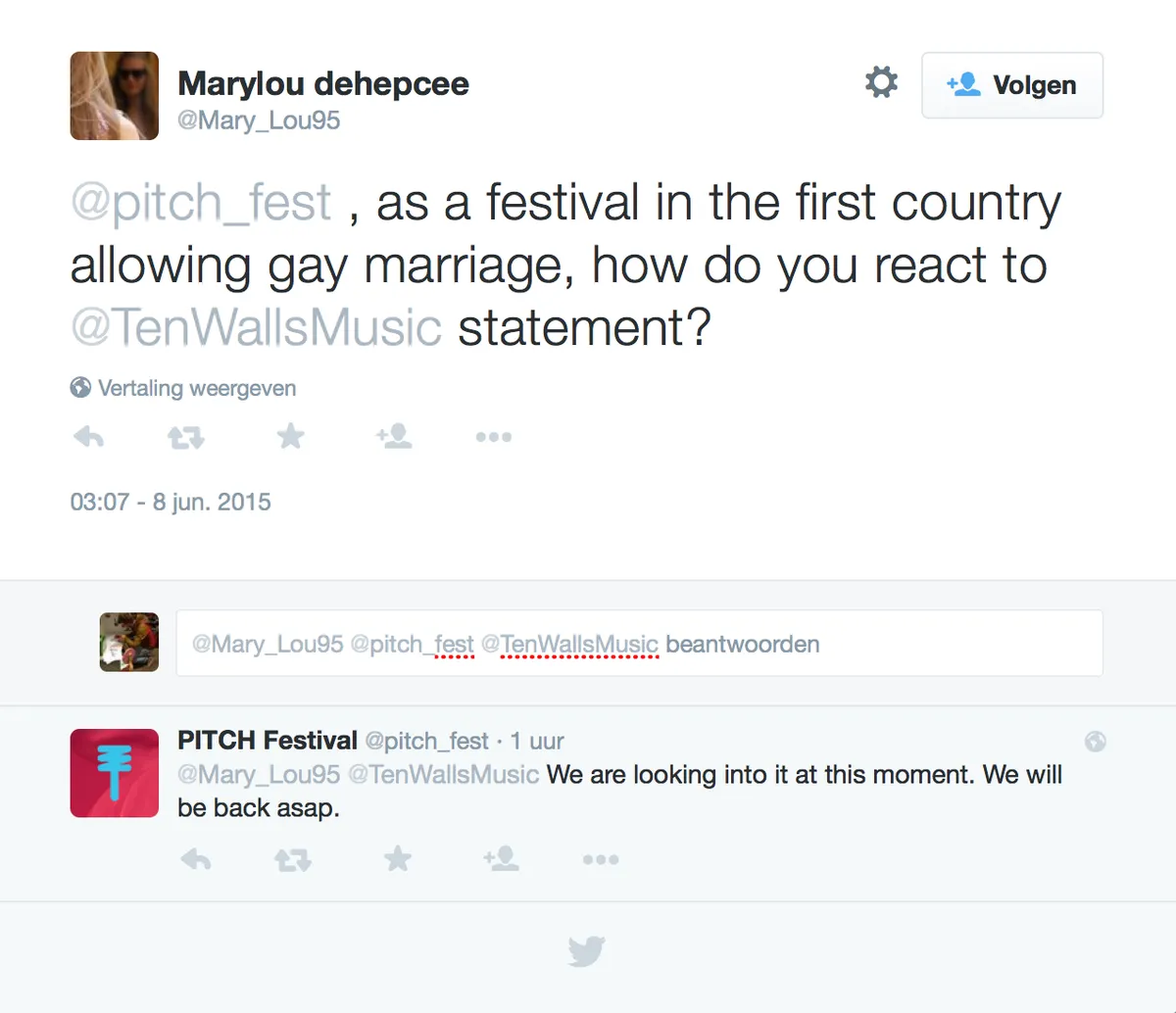 Verhorst over de uiteindelijke beslissing: "Het zag er al slecht uit, we waren geneigd deze artiest niet toe te laten. We hebben zijn agent inderdaad gesproken, maar zijn booking agency wilde ook niets meer met hem te maken hebben. Begrijpelijk, Ten Walls wordt in heel Europa geboekt en zij denken ook: wat is hier gebeurd? Voor ons waren er geen verzachtende omstandigheden, wij willen een artiest die zulke meningen uitdraagt niet op ons festival. Natuurlijk geen makkelijke beslissing, het blijft een enigszins arbitraire grens, misschien zijn er ook wel andere artiesten die dit vinden. Het publiek is voor ons het belangrijkst, en dat wilde Ten Walls ook niet meer op Pitch hebben."