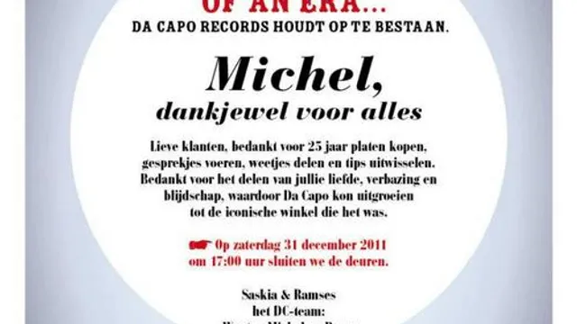 Michel wordt enorm gemist. Da Capo Records zal stevig gemist worden. Bij deze een laatste dank aan alle bezoekers, verzamelaars, medewerkers en vrienden van Da Capo: it truly was an amazing time!!!!"