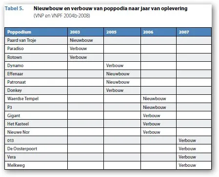 In het (ver-)bouwstaatje hiernaast van de jaren 2003-2007 staan drie podia die de tand des tijds niet doorstaan hebben: Donkey Shot in Heemskerk bleek ondanks een grondige renovatie van een kleine twee miljoen euro niet exploitabel (opvolger De Nozem & De Non hangt een eender lot boven het hoofd). De Waerdse Tempel sloot zes jaar na opening in 2012. Wat met 2500 bezoekers als 's lands grootste concertpodium gold (en vooral op ondernemersinitiatief en zonder subsidie draaide), werd bijna een uitvaartcentrum. Het Kasteel in Alphen ging in 2004 verbouwen en kwam heropend in 2007 in de problemen, maar werd via surséance gered door de gemeente. Waarna de wethouder besloot per 1 januari 2013 alsnog de subsidie te beëindigen en het Kasteel failliet ging.