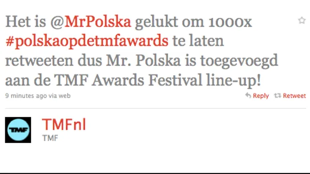 De twitterende achterban van Mr. Polska steunde de rapper meteen en binnen een half uur was #polskaopdetmfawards meer dan duizend keer geretweet én werd #polskaopdetmfawards trending topic in Nederland. Door deze actie op Twitter is Mr. Polska nu verzekerd van een plek op het TMF Awards Festival op 12 juni in Amsterdam.