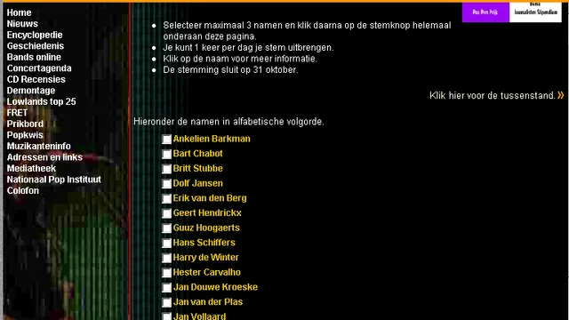 Met de publicatie van de longlist voor de Pop Pers Prijs 2003 zijn ook de speculaties over de mogelijke winnaar weer losgebarsten. Op het forum van De Subjectivisten (www.subjectivisten.org) gaan enkele kanshebbers elkaar al met woorden te lijf. En niet voor niets, want de Pop Pers Prijs is nog steeds de enige serieuze prijs voor popjournalisten in Nederland. Op de site van het Nationaal Popinstituut (NPI) is deze longlist voor de Pop Pers Prijs 2003 verschenen. De prijs wordt traditioneel op Noorderslag uitgereikt. Dit is het eerste jaar dat het publiek en een groep experts op deze longlist kan reageren. In het verleden was het mogelijk om op elk persoon te stemmen, zonder voorselectie. Volgens Mir Wermuth, voorzitter van de jury van de Pop Pers Prijs, moeten het publiek en de expert hierdoor een brede kijk krijgen. “We willen dat mensen door deze lijst ook op andere ideeën worden gebracht. We kregen jaarlijks dezelfde lijstjes binnen met bijna alleen nominaties voor de geschreven pers.” Die beslissing heeft ervoor gezorgd dat ook namen als Bart Chabot (schrijver Herman Brood-boeken), Ankelin Barkman (maker van de Milk-documentaire voor Het Uur Van De Wolf) en Dolf Jansen (3fm / Pinkpop-presentator) genomineerd zijn voor de longlist. Personen die niet full-time met muziek bezig zijn, maar volgens Wermuth wel iets toevoegen. “Stel dat Balkenende een economisch of cultureel artikel schrijft over muziek, dan heeft hij ook een kans om genomineerd te worden. Zolang het maar toegevoegde waarde heeft voor Nederland zelf. Als je Nederland negeert wordt het sowieso moeilijk om in aanmerking te komen. Anton Corbijn heeft de prijs bijvoorbeeld alleen kunnen winnen omdat hij dat jaar een tentoonstelling had in Nederland.” Ook al heeft Barkman maar één muziekdocumentaire gemaakt, toch is ze genomineerd. Dat heeft volgens Wermuth ook te maken met de doorlooptijd van verschillende media. “De geschreven media en radio zijn natuurlijk het snelst. Er is veel meer tijd en geld nodig om een documentaire af te ronden. Daarom kun je met een enkele documentaire ook genomineerd worden. De documentaire over André Hazes is zelfs een nationaal en internationaal monument geworden.” Het is voor Wermuth wel belangrijk dat de winnaar van de Pop Pers Prijs in 2003 actief is geweest, daar wordt deze op afgerekend. Het is dus geen oeuvreprijs, ook al heeft de prijs hier soms wel de schijn van gezien de winnaars vaak al vele jaren actief zijn in de muziekjournalistiek. Als de inzendingen van de experts uit de muziekwereld en het publiek binnen zijn, zal de jury van de Pop Pers Prijs de beide lijsten naast elkaar houden. Op grond hiervan wordt een shortlist gemaakt van 5 tot 10 namen. Van de mensen op deze lijst gaat de jury al het werk bekijken en/of beluisteren om uiteindelijk tot één winnaar te komen. 3VOOR12 peilde alvast de meningen van enkele genomineerden met de vraag: ga je die prijs winnen? Erik van den Berg (OOR): “Ik denk niet dat ik ga winnen, omdat hij wordt toegekend aan mensen die ook dit jaar veel hebben geschreven. Ik schrijf zelf niet veel meer, maar coördineer een rubriek. Als het een oeuvre prijs zou worden, had ik meer kans gehad. Ik denk namelijk niet dat je die prijs krijgt voor het onnavolgbaar coördineren van een rubriek. Wat er anders aan mijn schrijfstijl is? Dat laat ik aan anderen over. Ik vraag me overigens wel af wie die longlist heeft gemaakt. Ik mis bijvoorbeeld Jacob Haagsma en Robert Heeg. Die schrijven voor 5 of 6 verschillende media erg vlotte stukken. Het zijn goede all-rounders. Een talent als Roger Teeling is ook niet genomineerd, al zou dat misschien te vroeg zijn. Maar het is onzin dat iemand die één documentaire maakt in het jaar genomineerd wordt. Of mensen die zijdelings iets met popmuziek hebben te maken als Bart Chabot en Dolf Jansen. Waarom die dan wél? Maar ik vind het eigenlijk wel moeilijk om commentaar te geven omdat ik zelf ook op die lijst sta.” En wie moet er winnen? “Ik vind dat Peter Bruyn hem zou moeten krijgen. Of Swie Tio, die heeft een ontzettend bijzondere schrijfstijl, heel prikkelend. En dat al meer dan twintig jaar.” Britt Stubbe (OOR, Het Parool): “Ik hoop uiteraard dat ik ga winnen, maar ben er niet ziekelijk mee bezig. Heb geen troepen ingeschakeld om op me te stemmen. Als ik win, dan graag op eigen kracht. Mocht ik hem winnen, dan liever niet omdat ik een vrouw ben. Zoiets zou mee kunnen spelen. Het geld zou ik wel kunnen gebruiken voor een documentaire of een boek. Ik denk dat de journalistieke benadering van een artiest me anders maakt, ik heb het in interviews en stukken niet alleen over popmuziek. Je moet altijd goed de actualiteit bijhouden zodat je het daar ook met een bandlid over kan hebben. Als er oorlog is in Irak wil ik weten hoe een Amerikaan daar over denkt.” En wie moet er volgens jou winnen? “Van mij mag Erik van den Berg winnen, al heeft hij de laatste tijd niet echt veel geschreven, dus dan is het eerder een oeuvreprijs. Het zou leuk zijn als iemand gaat winnen die nú iets goeds doet. Hester Carvalho bewonder ik vanwege haar aanpak. Ze gaat verder dan de meeste popjournalisten, ze schrijft meer vanuit een populair wetenschappelijke invalshoek. Het is jammer dat Danny Koks er niet tussen staat, die schrijft duidelijk en toegankelijk voor de OOR en Trouw.” Peter Bruyn (GPD dagbladen, OOR, Aloha, Rails, etc) “Ik ben er absoluut niet mee bezig en heb denk ik een kans van 1 op 50. Ik doe gewoon al bijna 25 jaar mijn werk voor verschillende kranten en tijdschriften die geïnteresseerd zijn in mijn verhalen. Ik kies mijn eigen onderwerpen, want over Idols-sterretjes ga ik echt niet schrijven. Uiteindelijk ben je op zoek naar het ultieme verhaal, dat is op dat moment de waarheid. Voor de Pop Pers Prijs heb ik geen favorieten, dan zou ik me eerst moeten verdiepen in de criteria die die prijs heeft. Veel mensen in die lijst ken ik niet eens. Ik vond het in het verleden bijvoorbeeld wel terecht dat Jip Gols