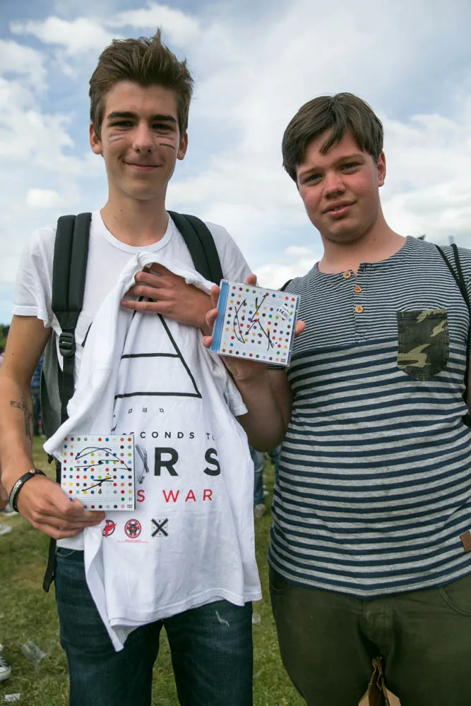 Wie wel bewust de rij zijn gaan opzoeken, zijn Maarten en Mitchell (beiden 16) uit Oss. Al drie jaar fan van de band en zij waren maar liefst 3,5 uur van tevoren al in de rij. Praktisch toen de poorten net open waren. Pijnlijk voor de band Phoenix; die hadden even daarvoor een sessie. Maarten: 'Iedereen die binnen zat, kwam niet voor hun, maar voor 30 Seconds To Mars.' Om de tijd te doden, hebben ze met andere fans van de band lopen kletsen en werd er zelfs getwisterd met platen van de band. Nu, 3,5 uur later glundert het duo compleet. Maarten: 'Ik voel mijn hart nog steeds bonzen.' Valt hun ook op dat de meeste fans vrouwen zijn? Mitchell: 'Ja, die gaan allemaal voor Jared Leto. Maar wij zijn al drie jaar fans vanwege de muziek,' verzekert hij.