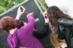 Dat blijkt vooral links van de tent, waar zes meiden door een kier in het hek gluren. 'We komen voor Jared Lèh-to om zijn mooie blauwe ogen te zien!' Naar hem schreeuwen gaan ze niet doen, want 'dat ziet er dom uit hoe we hier erbij staan.' De handtekeningsessie schuwen ze, want het geloof is er niet dat het nog lukt. Milou (18) doet niet mee met de sessie, omdat ze dan de cd moet kopen. 'Waarom zou ik dat doen, als ik dat toch kan downloaden?'