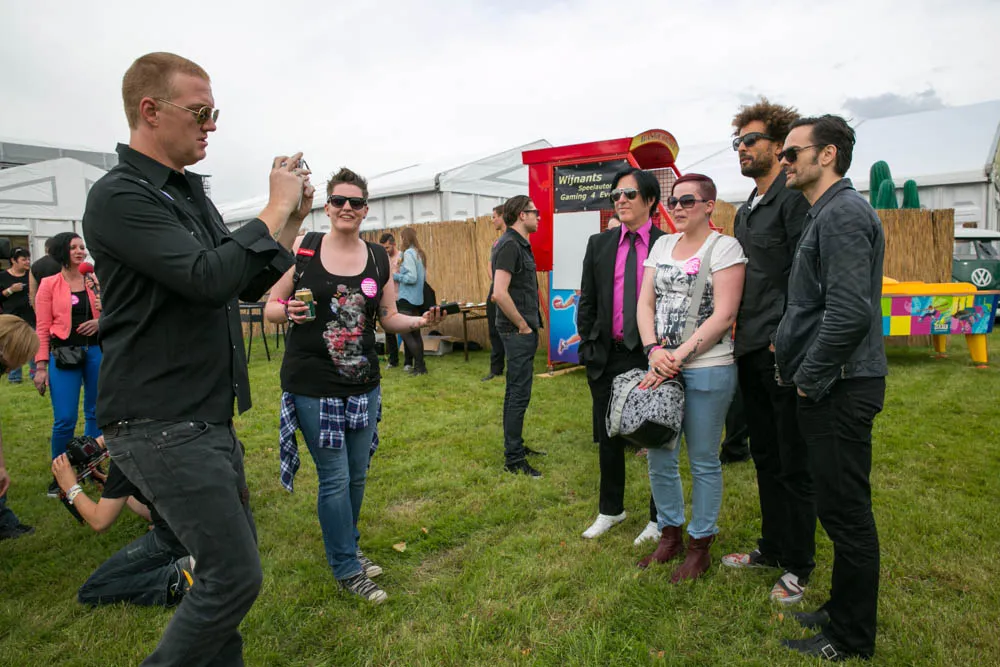 Een uur na de knuffel zit Homme achter bij het artiestengedeelte te kletsen met een vrouw en kind. Om de hoek staat naast de barbecue een groep nerveuze fans die een meet & greet hebben gewonnen via 3FM. Het zijn voornamelijk dames, allemaal getooid met donkere haren en een outfit die er bij hoort. Als Homme even later op zijn gemak met de rest van de band komt aanlopen, is de opluchting voelbaar. De Amerikaan is relaxed en beschaafd. Knuffels worden uitgedeeld, praatjes over het schrijven van nummers, een tekening op een been, kort interviewtje met 3FM, alles is geen probleem.