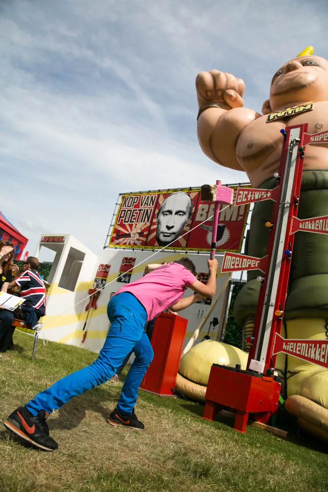 Pinkpop: best een geëngageerd festival als je erover nadenkt. Al die roze hoedjes zijn reclame voor Amnesty International en Oxfam Novib staat op het festival met info over de handel en wandel van The Big Ten, 's wereld grootste tien bedrijven. En lijstduwer Jan Smeets neemt gewoontegetrouw het kabinet een paar keer op de korrel. Dit jaar is er meer. Wie voorbij de Kalm aan Laan loopt, heeft hem/het al gezien: een reusachtige, opblaaspresident die wat weg heeft van Президент Poetin. Een verafgoding? Verre van...