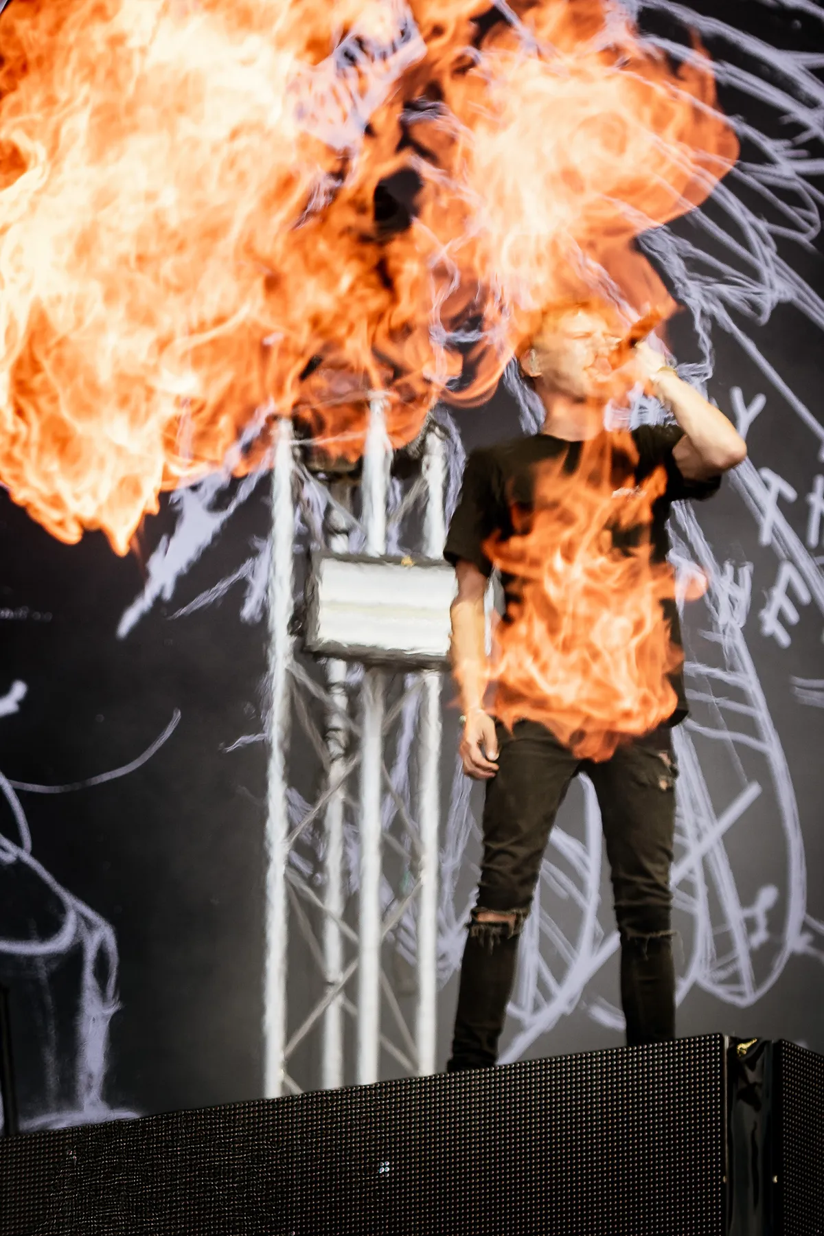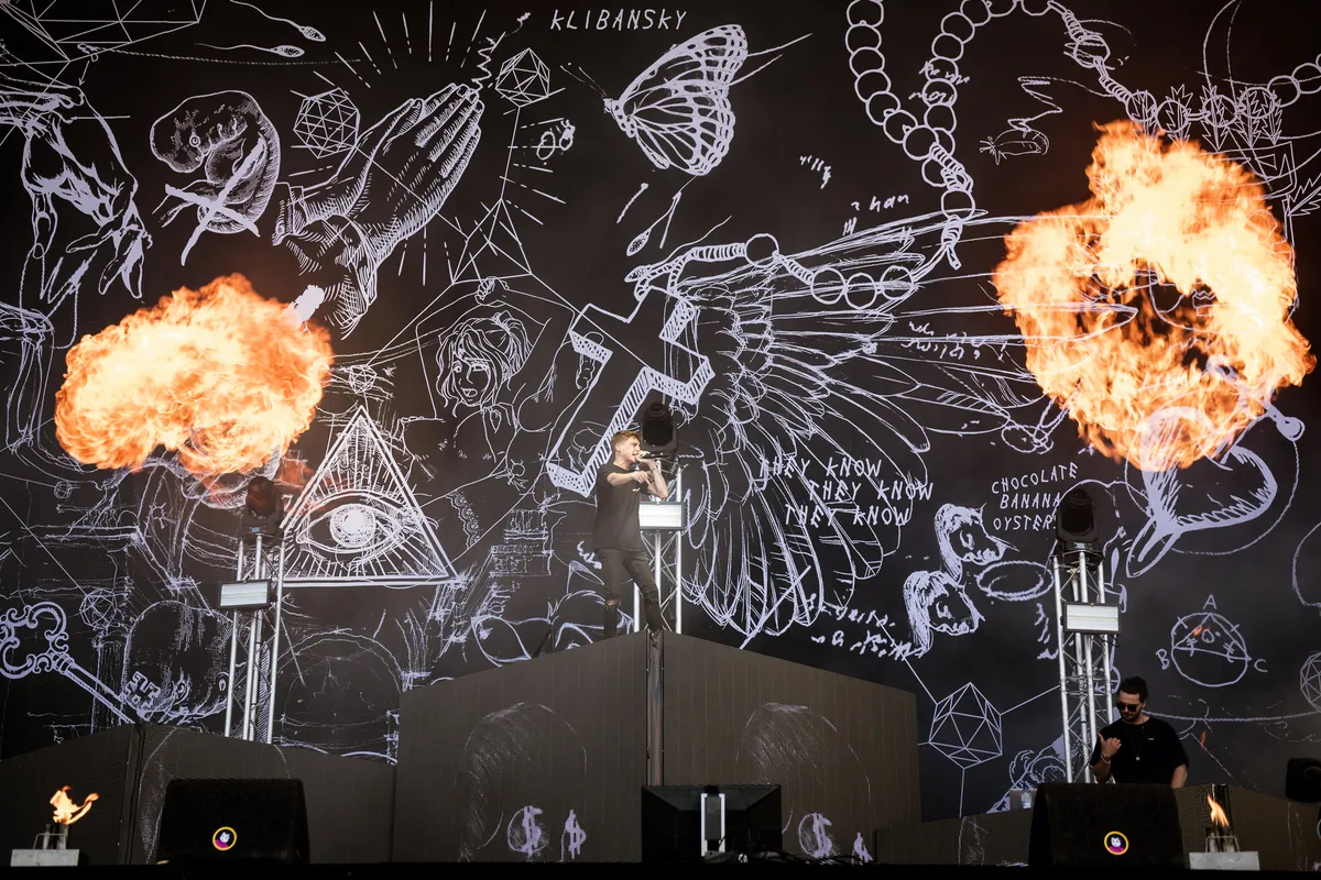 En dan is–ie er uiteindelijk, de jongen die zorgde dat zelfs je neefje van acht ja zei tegen MDMA, het streaming-kanon dat met zijn tweede album Alleen een soort-van-serieuzere kant van zichzelf wilde laten zien. Ook z’n show is ambitieuzer dan ooit. Mét band bestaande uit dj Lastpak, een drummer die een log fundament in elkaar timmert en een gitarist met Rage Against The Machine-shirt en en EVH-gitaar met Louis Vuitton-opdruk. Het maakt z’n tropical house er niet onderscheidender op en zijn stijve raps niet soepeler, maar geeft het wel genoeg power om de mainstage aan te kunnen. En dan heeft–ie ook nog een vijftal forse stages op het podium staan, patserige blokken met LED-walls waar nog meer Klibansky langs flitst. De show is in ieder geval goed uitgedacht, inclusief vlammenwerpers, danseressen, ballad op de barkruk en zelfs een Hazes-momentje. Een ‘sorry dat ik te laat ben’ hoef je niet te verwachten, wel heel veel streaminghits, ‘waar is dat feestje?’ en ‘ken je deze nog nog nog nog?’.