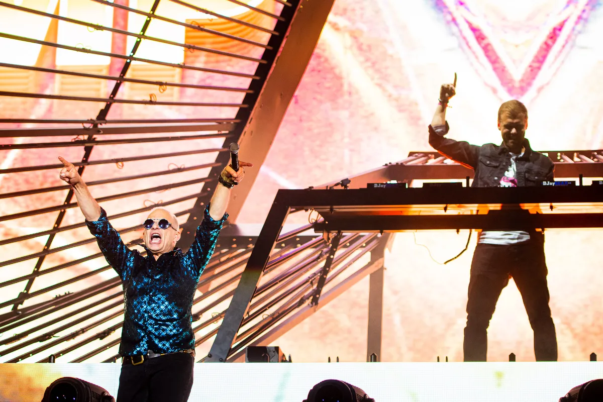 Die krijgen we allemaal niet te zien, maar er beklimmen wel degelijk een paar vocalisten het podium. Allereerst David Lee Roth, de frontman van Van Halen die zo’n dancegek bleek dat híj Armin smeekte of hij naar Landgraaf mocht komen. In een blauw glitterpakje en mal zonnebrilletje staat hij dansend op de nok van het podium. Zijn stem sprankelt wellicht niet zoals je hoopt bij ‘Jump’, toch voelt het als een iconisch moment. Dan valt de bijdrage van zanger Sam Martin (wie is dat?!) met beelden van een hoogzwangere vrouw op de schermen (?) nogal dood, net als zangeres Bonnie McKee.