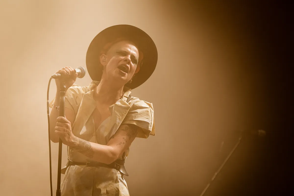 Wat is Sharon Kovacs toch een heerlijk karakter. Met haar malle hoedje, gemillimeterd haar en dikke zwarte strepen onder haar blauwgeverfde ogen ziet ze eruit als de schurk in een oude Batman-film van Tim Burton. En zo walst ze ook over het podium, theatraal elke uithaal aangezet. Ze lijkt er niet helemaal in te zitten – er is iets mis met haar zendertje – maar ownt het podium toch volledig.