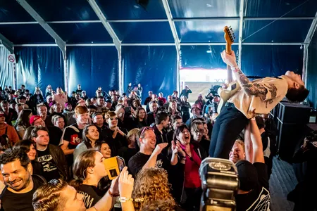 Twee jaar geleden stond Mt. Atlas’ frontman Sven Vek ook al op hetzelfde slot met punkband The Ten Bells. Dit jaar doet hij opnieuw een worp naar de grote podia, deze keer met een zwaarmoediger geluid dat een voorliefde voor System Of A Down verraadt, alleen dan raggen de gitaren nog iets verteerbaarder en meer rechtdoorzee. Ja ja, dit is echte boze-mannen-gitaarmuziek voor mensen bij wie het leven zo nu en dan wel érg zwaar valt. Hoe zwaar het leven wel niet is, wordt nog eens duidelijk benadrukt door de visuals die achter de band op het scherm worden geprojecteerd. En Vek, het showmannetje dat hij is, gaat daar dus volledig in op, laat zijn benen met zichtbare moeite over het podium slepen en zingt en schreeuwt met zijn gruizige strot in de microfoon alsof hij hoopt dat hij als een ware Dementor daar misschien wat leven uit kan zuigen.