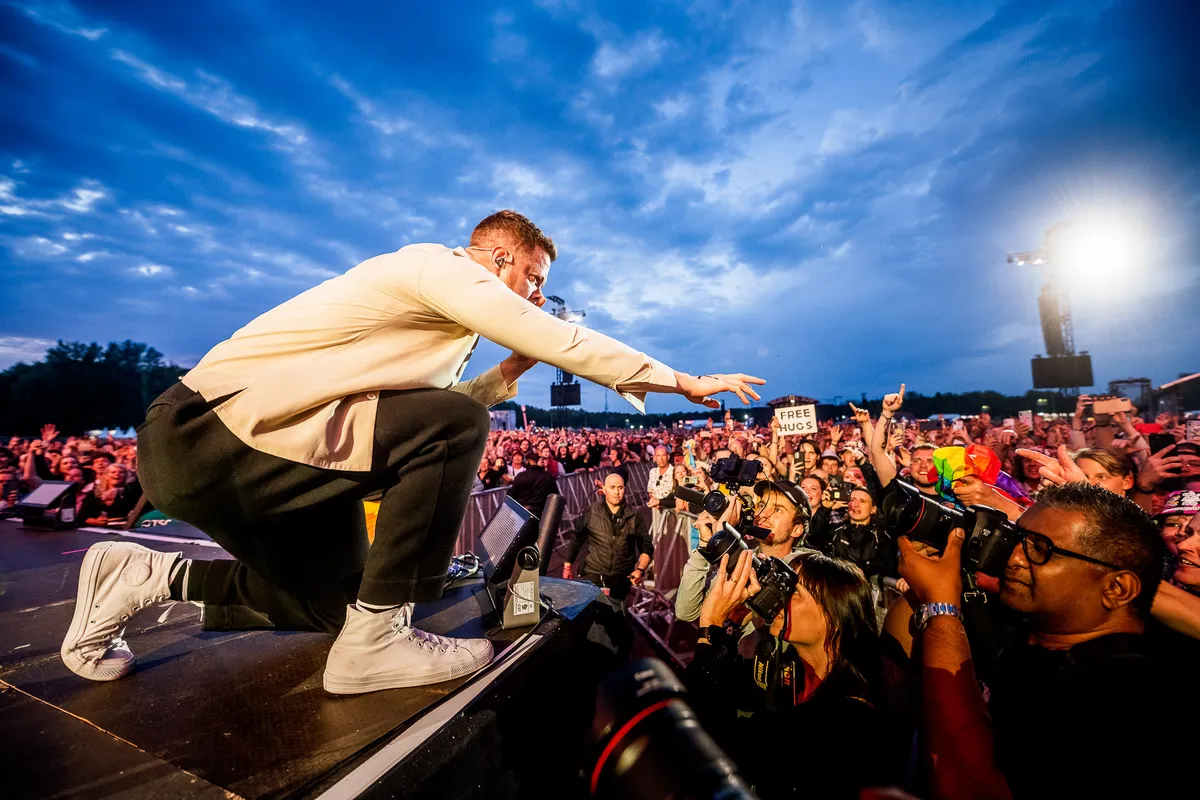 Het is de grootste deceptie van Pinkpop 2022: waar zijn de trommels?! Die gigantische, logge dingen waarop zanger Dan Reynolds ramt bij wijze van special effect?! Die dingen vatten zo ongeveer samen wat de klank is van Imagine Dragons: groots en theatraal, tot over het kitscherige heen. Een epische stadionrockband die klinkt als een Michael Bay-film, met explosieve refreinen, loodzware drums en diepe sub-bassen. Muzikale elementen die zich uitstekend lenen voor vlammenwerpers en CO2-kannonen, en al helemáál voor een Pinkpop-headlineshow. Maar 'Radioactive' begint helemaal niet explosief, en die trommels heeft de band blijkbaar thuisgelaten. Sterker nog: 'Radioactive' begint heel klein en intiem... op de piano.