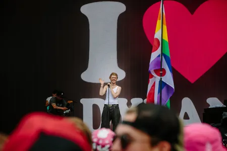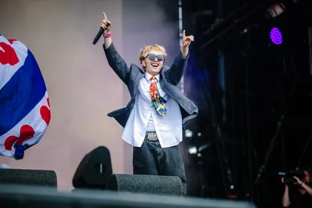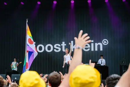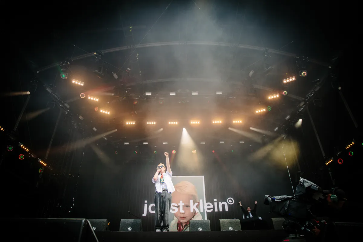 Het ene moment sta je in een wall of death zo groot als het eerste vak, gniffel je om ‘Crazy Frog’ (‘ik heb een tatoeage van een kikker’, roept Joost zelf) of rap je zijn domste slimme lines mee (‘ik ben fly net een meeuw, het is de blanke Paul de Leeuw’). En het volgende sta je keihard mee te janken met de Friese rapper Joost. Echt waar, het is nogal een wervelwind van emoties bij de opener van de Noord-stage op zondag. ‘Ik vind jullie echt lief’, grinnikt hij. ‘Vroeger op mijn kinderfeestje kwamen er niet twee of een, maar nul vrienden. En nu sta ik hier.’