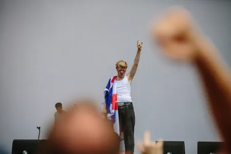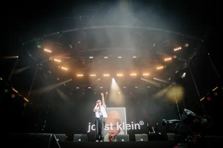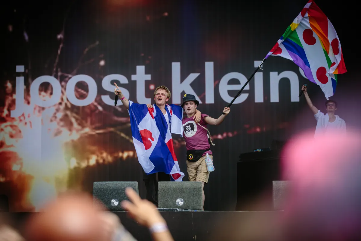 Echt tijd heb je niet om erbij stil te staan, want Joost is alweer grapjes aan het maken, hij vraagt om een gigantische wall of death (en krijgt die natuurlijk ook). Maar hij eindigt met een oprecht, klein liedje over de crematie van zijn pa. Hij zingt het op de rand van het podium, gewikkeld in een Friese vlag. En het hele veld geeft hem hartjes, het hele veld overlaadt hem met liefde.