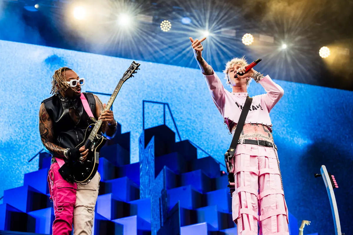 En die jas past hem wel. Dan komt-ie jammer genoeg niet binnen met de gevechtshelikopter waar hij uit leunde bij z’n AFAS-show (ja serieus!), maar wel op een brandende kistenpiramide die onder z’n benen splijt als een ravijn. Er zijn vlammenwerpers. Een band die een rockband LARP’t te zijn, met een continu solerende gitarist die een onafgemaakt potje boter-kaas-en-eieren op z’n wang heeft getatoeëerd. MGK weet ook precies wanneer-ie de pit moet opentrekken, laat z’n mitrailleurflow nog effe gelden in ‘FLOOR 13’ (met sneer naar Eminem), splijt dan weer de crowd voor een brandende piramide met ‘WWIII’ en ‘WW4. Terwijl z’n band in de zevende versnelling speelt opent-ie een bottenkrakende moshpit. Letterlijk. Hopen dat die ene bezoeker oké is.