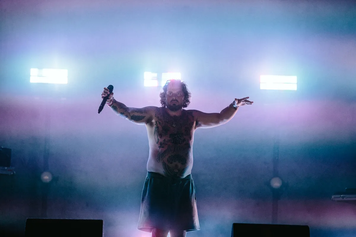 Hmmmm, de echte ZG-connaisseur ziet dat er iets is veranderd in Zwangere Guy. Altijd al waren zijn shows zo scherp als Japanse Santokumessen, en dat is vandaag niet anders. Maar waar hij vroeger een manische gekte uitstraalde op het podium, heeft Guy op Pinkpop de rust gevonden van een zenboeddhist. ‘Ik ben 16 maanden sober’, declameert de Vlaamse rapper halverwege de show. Groot applaus. Ah, dat is het dus. ‘Aan iedereen die battlet met zijn verslaving, met zijn demonen: ik ken ze. Er is maar één zaak die mij helpt: zelfliefde. Ik ben 20 kilo afgevallen.’ En ook: ‘Veel artiesten rappen over drugs, drank, bitches. Ik doe niet mee aan die shit.’